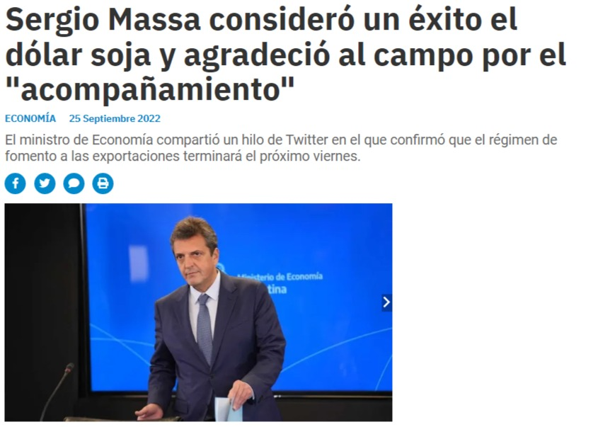 - 25/09/2022 – Sergio Massa consideró un éxito el dólar soja y agradeció al campo por el «acompañamiento» (128019)