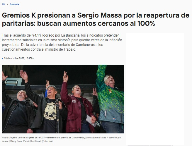 - 03/10/2022 – Gremios K presionan a Sergio Massa por la reapertura de paritarias: buscan aumentos cercanos al 100% (128025)