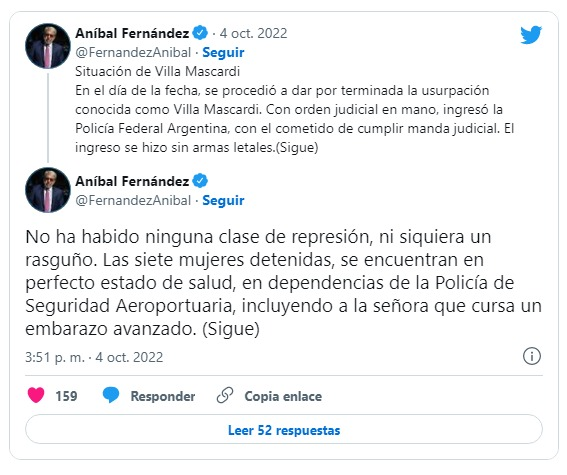 En horas de la tarde, ante la explosión de protestas de «arrepentidos por dos días» del parapolicialismo fomentado desde la Rosada y la Recoleta. Salieron a decir que no fue una «represión» y mandaron al menos creíble de todos a tuitear sobre el tema: claramente, hablamos del Ministro de Seguridad de la Nación que mandó un «No ha habido ninguna clase de represión. las siete mujeres detenidas se encuentran en perfecto estado de salud, en dependencias de la Policía de Seguridad Aeroportuaria».